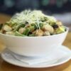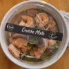 Camarones salteados en ajo, cebolla morada, palta, cebollín, leche de tigre y cilantro.