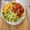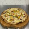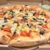 Pomodoro, queso vegano, choclo, tomates cherry, cebollín, champiñones y mix de aceitunas.