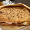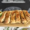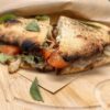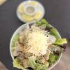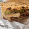 Mozzarella, camarones salteados en ajillo, rodajas de palta, lechuga, cebolla morada y salsa de ajo.