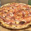 Salsa blanca, mozzarella, choclo, ají verde, pollo, tocino, mix de morrones, carne de res, mix de aceitunas y extra queso.