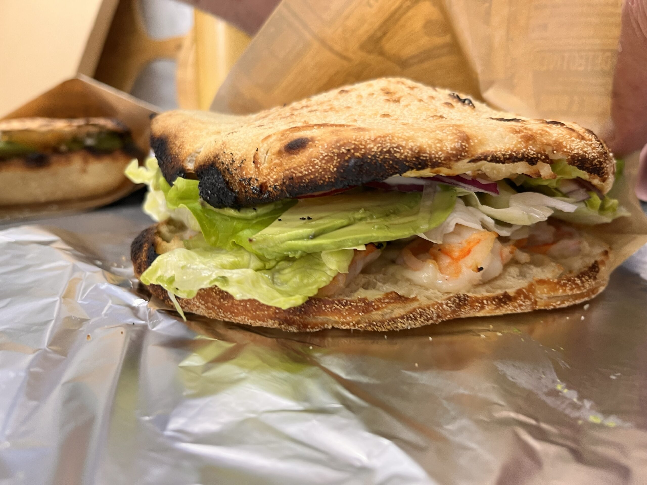 Mozzarella, prawns marinated in garlic, slices of avocado, lettuce, red onion and garlic sauce.