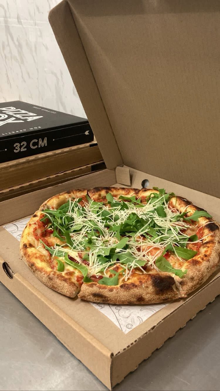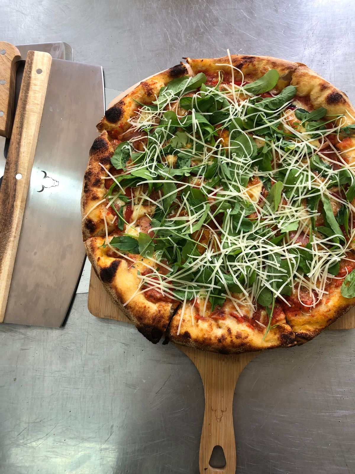 Pomodoro, mozzarella, prosciutto, rúcula, pimentones asados y queso parmesano.