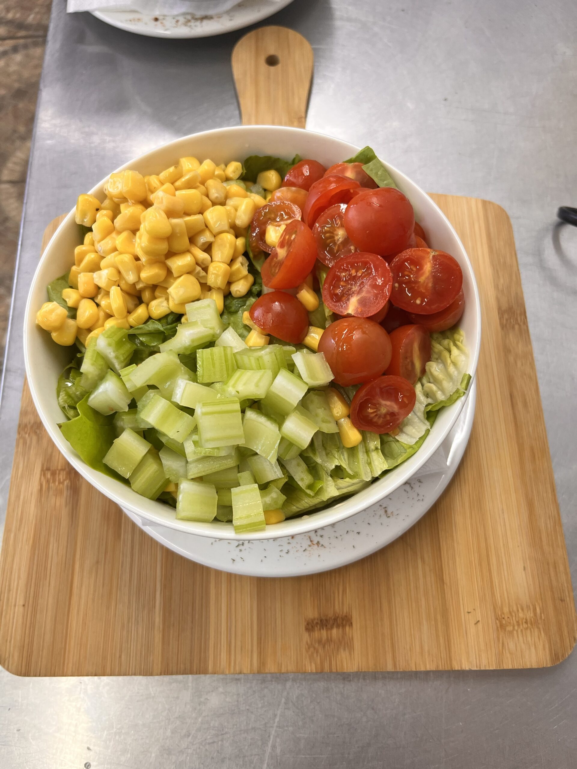 Lettuce, cherry tomatoes, celery, corn and homemade dressing.
