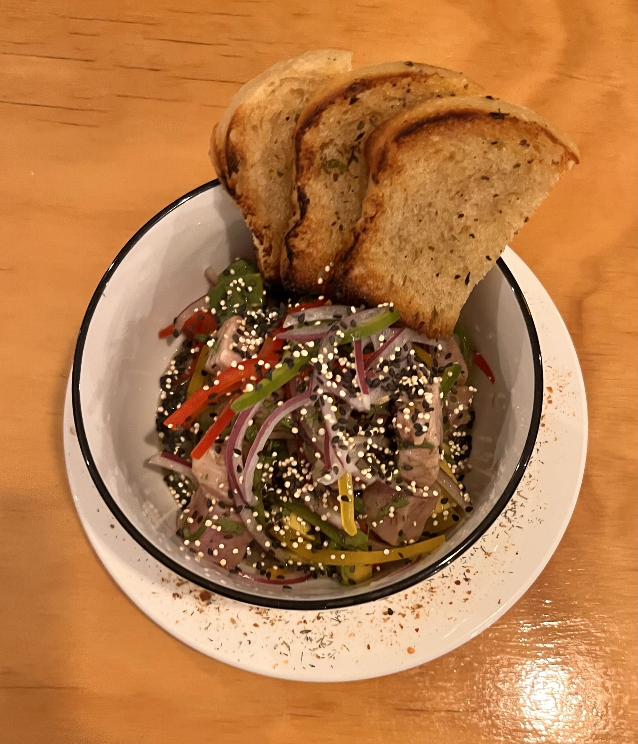 Dados de atún, palta, mix de morrón, cebolla morada, cilantro, eneldo, soja, limón sutil y sésamo.