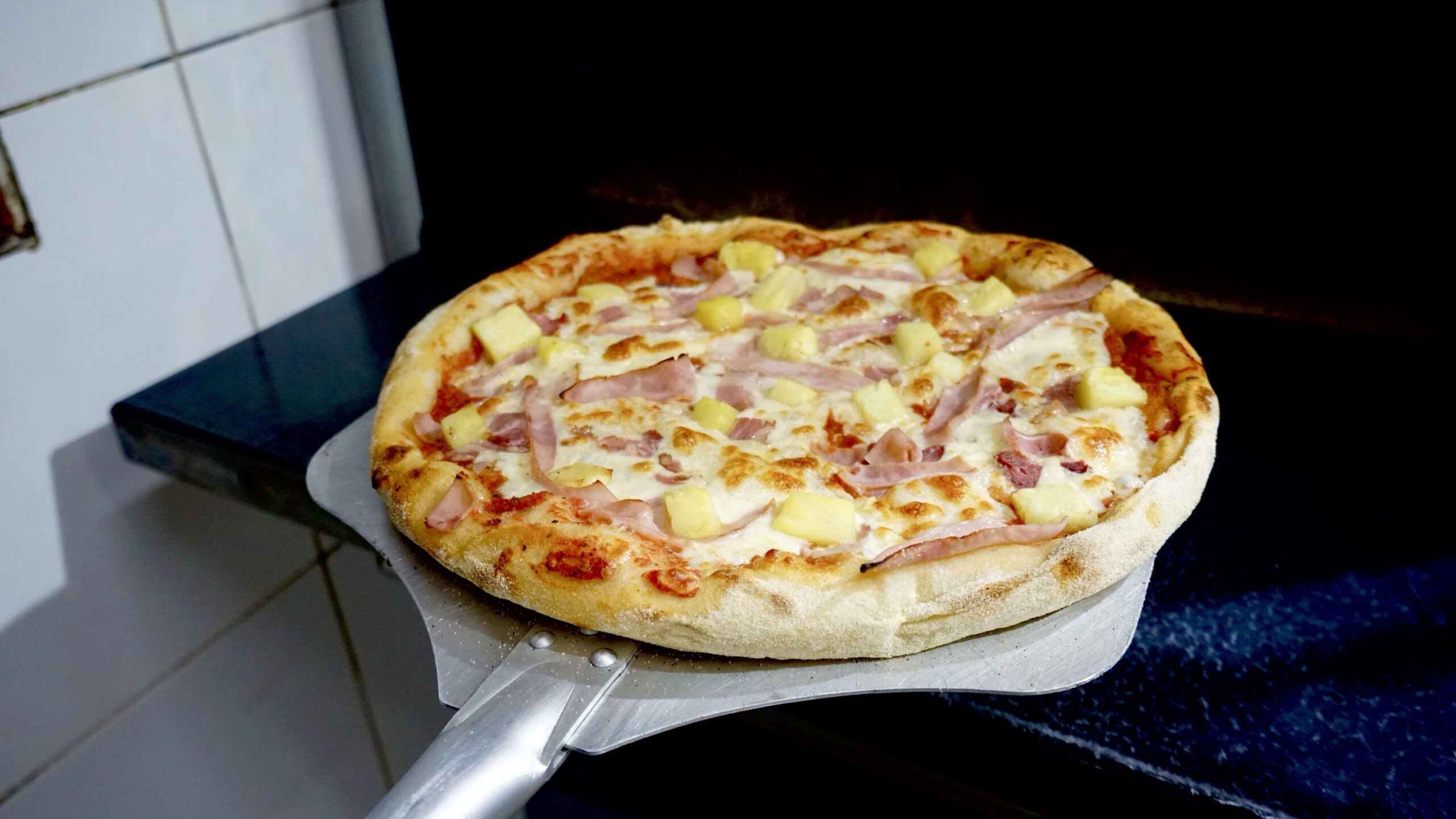 Pomodoro, mozzarella, tocino, jamón y piña natural.