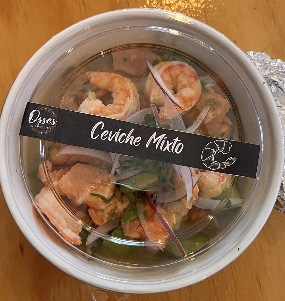 Salmón, camarones, cebolla morada, cilantro, cebollín, palta y leche de tigre.