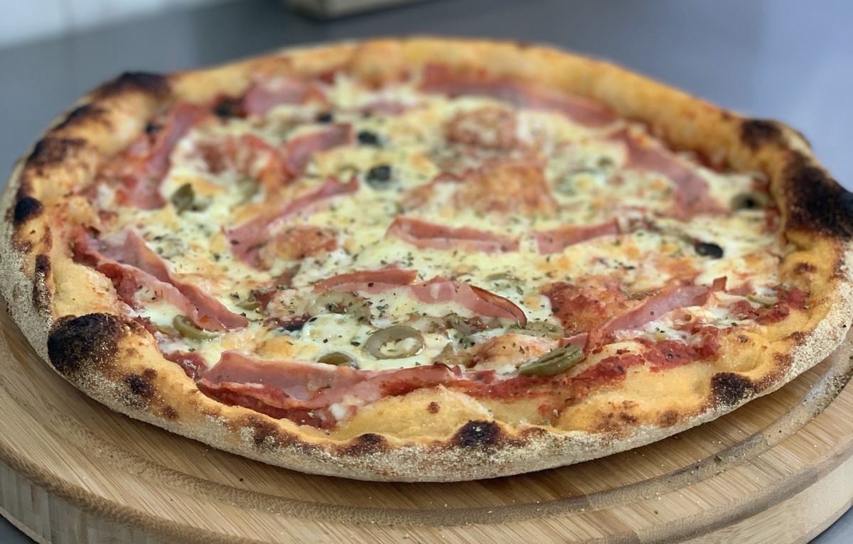 Pomodoro, mozzarella, jamón y mix de aceitunas.